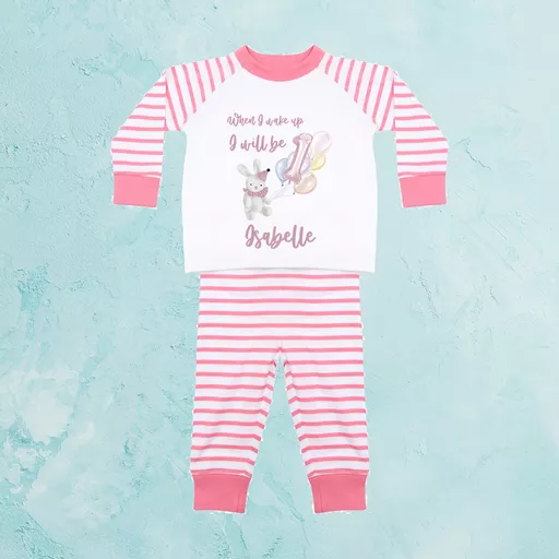 Girls Pink Personalised striped pyjamas with name and age personalisation for Ages 1, 2 and 3.