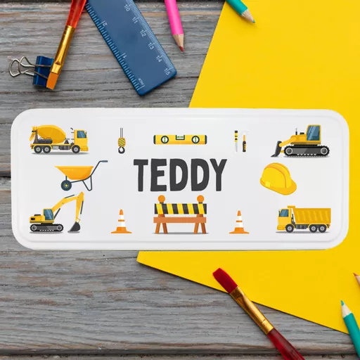A personalised white stainless steel hinged pencil tin, 18cm x 7.6cm x 2.3cm.